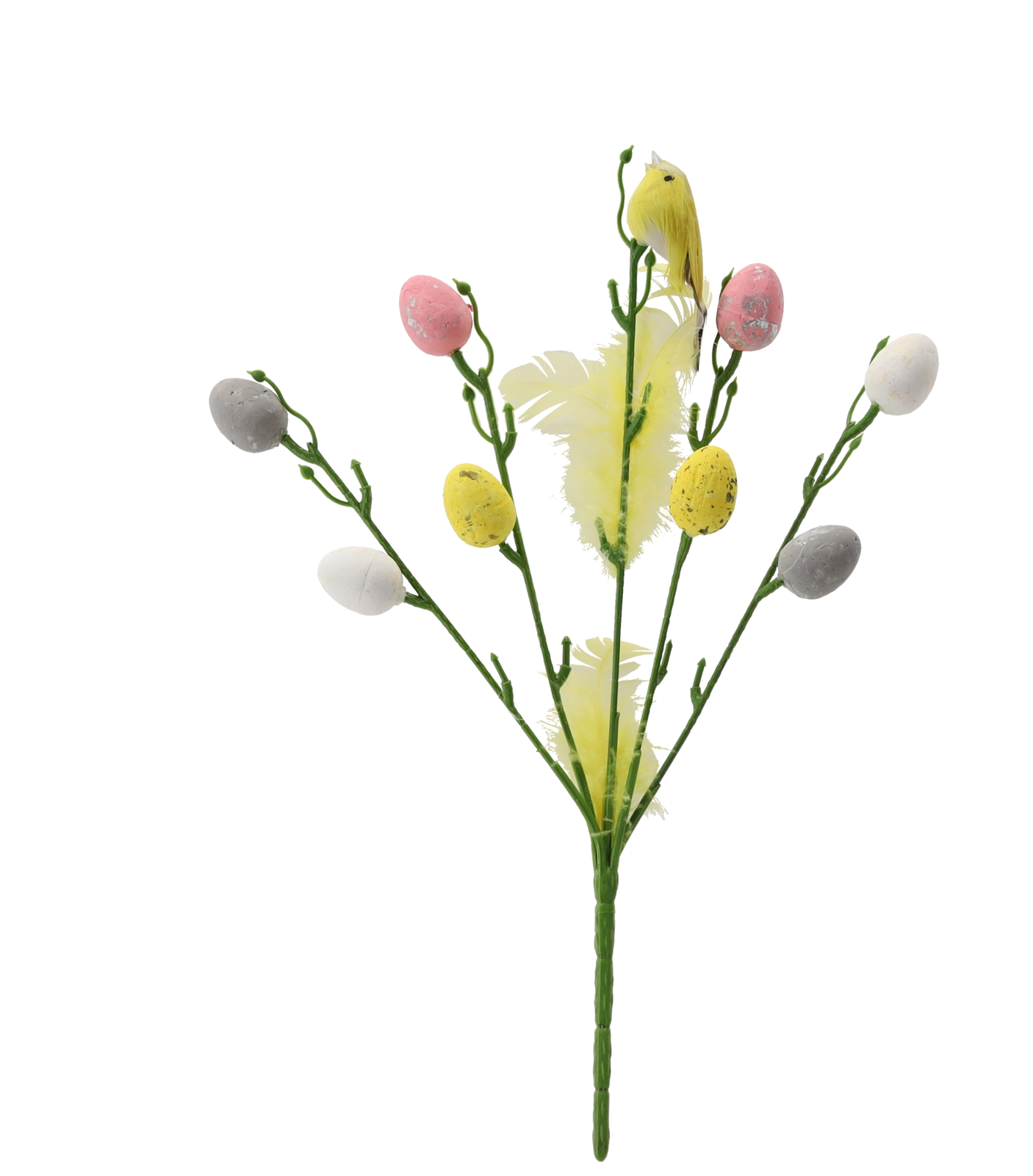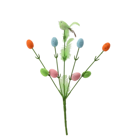 Ez a pálcára erősített húsvéti dekoráció egy finom ágacskát, egy aranyos madárkát és apró tojásokat egyesít – a tavasz és az új élet szimbólumait. Ideális virágkötészeti kompozíciókhoz, koszorúkhoz, asztali díszekhez, de önálló hangsúlyként is megállja a helyét egy vázában. Univerzális kialakításának köszönhetően könnyedén illeszkedik a hagyományos és a modern enteriőrökhöz is.