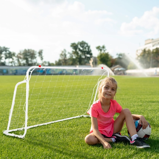 A telepítés néhány percet vesz igénybe – a kapu könnyen szerelhető és szétszerelhető, a háló klipszekkel rögzíthető, a csomag földbeverhető cövekeket is tartalmaz. A szerkezet ellenáll a deformációnak és az időjárásnak, így romló idő esetén sem kell szétszedni.