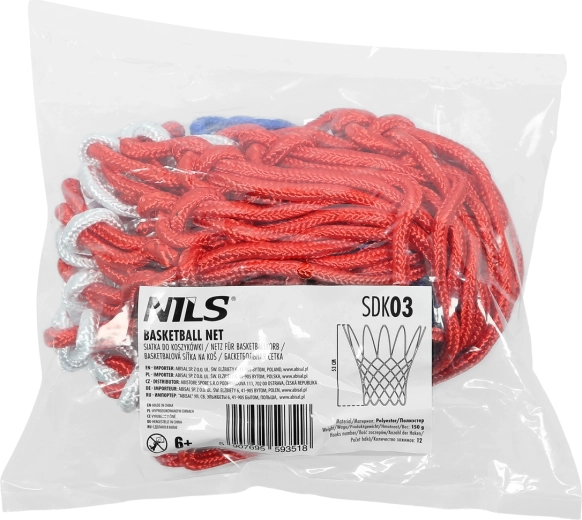 A NILS SDK03 kosárlabda háló megbízható csere megoldás szabadidős és edzéscélú használatra egyaránt. A robusztus, fonott poliészternek köszönhetően erős, tartós és kültéri körülményekhez is alkalmas. A szabványos 12 szem gyors és biztos rögzítést kínál a legtöbb, 45 cm átmérőjű gyűrűn.