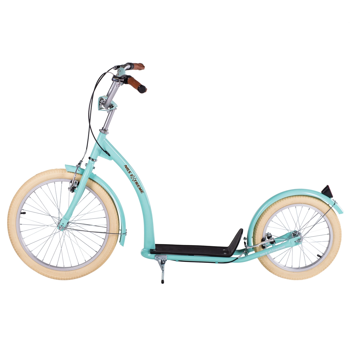 A mentazöld NILS Extreme WH222 rollert kényelmes és biztonságos közlekedésre tervezték városban és azon kívül is. A nagy pneumatikus abroncsok alumínium felnin kisimítják az úthibákat, míg az acél váz szilárdságot és hosszú élettartamot garantál. Az elöl 20", hátul 16" kerék fokozza a stabilitást, a terepjáró képességet és a magabiztosságot kanyarokban.