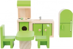 Ez a részletgazdagon kidolgozott konyhakészlet mindent kínál, amire a kis szakácsoknak szükségük van – mosogató, tűzhely, hűtő, asztal és két szék, kellemes, természetes fa és friss zöld akcentusok kombinációjában. A tömör faanyag stabilitást biztosít, készen áll a mindennapos játékra.