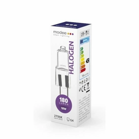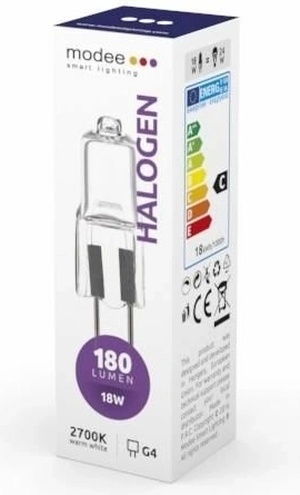 A MODEE G4 18 W halogén izzó az ECO sorozatból meleg fehér fényt 2700 K, azonnali fényerő-felépülést és szabályozható fényáramot kínál. Speciális kialakításának, a IR visszaverő rétegnek és a xenongáztöltetnek köszönhetően nagyobb hatékonyságot és egyenletes fényt biztosít 360°-os szögben.