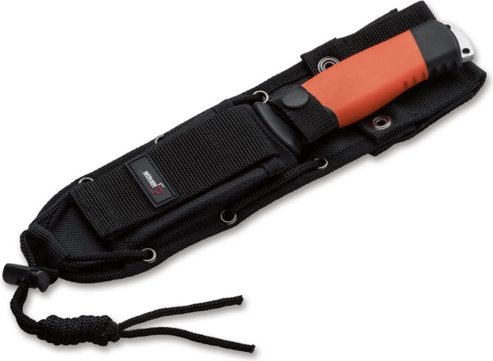 A gumírozott markolat kényelmes fogást ad, csúszásmentes felülete pedig nedves körülmények között is minimalizálja a kicsúszás kockázatát. A feltűnő narancssárga szín növeli a kés láthatóságát fűben vagy avarban. A csomag tartalma egy praktikus nylon tok a biztonságos hordáshoz.