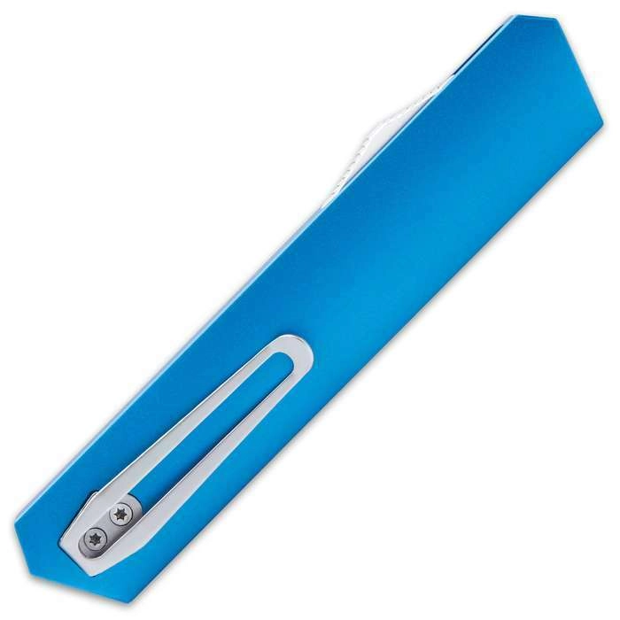 A markolat CNC-marású alumíniumból készül, látványos kék színben, biztos fogást nyújtva, miközben megőrzi az alacsony tömeget. A praktikus zsebklipsz megkönnyíti a hordást és a gyors használatot, míg a nejlon tok védi a kést szállítás közben.