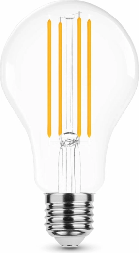 Ez az A70 formátumú LED filament izzó ötvözi a klasszikus megjelenést a modern hatékonysággal. Az átlátszó „szál” egyenletesen osztja el a LED chipeket, így 360°-os árnyékmentes megvilágítást és vonzó látványt nyújt nyitott vagy lefelé irányított függesztett lámpatestekben.