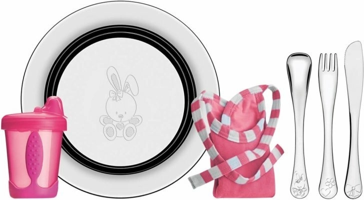 - Gyerek rozsdamentes evőeszköz (villa, kanál, kés), gyerek rozsdamentes tányér, gyerek előke, zárható műanyag pohár 200 ml