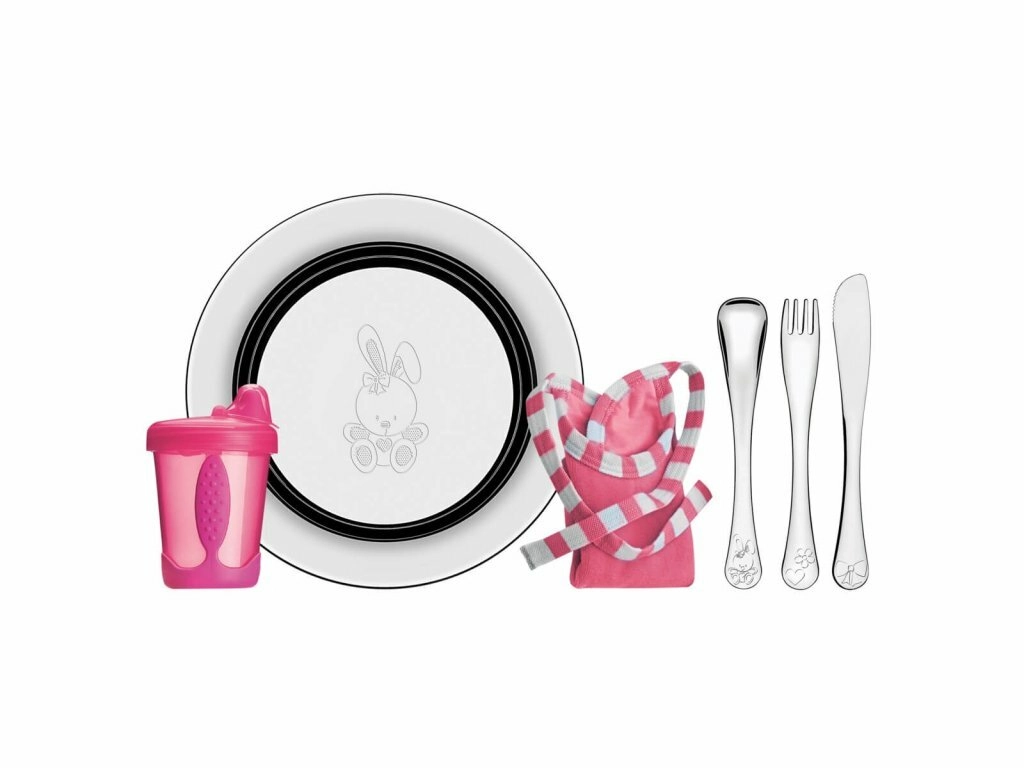 Aranyos és praktikus Tramontina Le Petit gyerek étkészlet rózsaszín színben mindent kínál, amire a kicsi étkezőnek szüksége van. Tartalmaz rozsdamentes evőeszközt (villát, kanalat és kést), rozsdamentes tányért, puha előket és zárható, 200 ml-es műanyag poharat BPA-mentes polipropilénből. Vidám mintás nyelek ösztönzik az önálló étkezést és megkönnyítik a tisztán tartást.