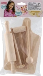 A szett minőségi fából készült, sima felülettel a kényelmes és biztonságos használatért. Az univerzális daraboknak – vágódeszka, sodrófa és klopfoló – köszönhetően a gyerekek könnyen utánozhatják az ételkészítést, és elsajátíthatják az alapvető konyhai tevékenységeket.