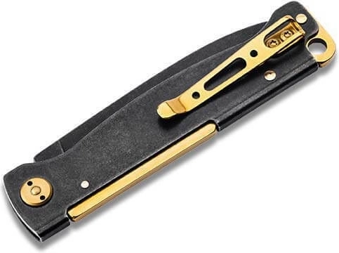 A Blackwash felületű acél markolatot sárgaréz részletek egészítik ki, időtálló megjelenést adva a késnek, amely egyaránt illik farmerzsebhez és zakóhoz. A praktikus zsebklipsz és a zsinórlyuk növeli a hordási kényelmet és a gyors hozzáférést.