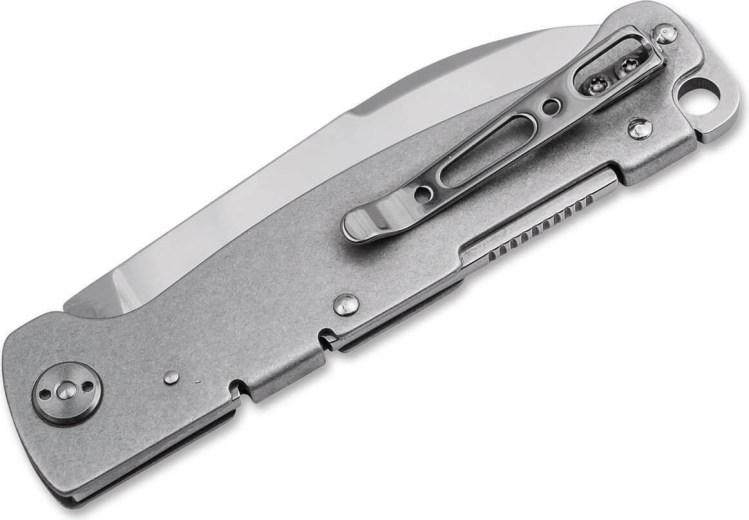A minimalista rozsdamentes acél markolat mutatós Stonewash megjelenéssel ellenálló a karcolásokkal szemben és kényelmes fogást ad. A kés manuálisan nyitható pengehornnyal, és megbízható backlock zárral rögzül, így biztonságos a használata. A praktikus zsebklip és a zsinórlyuk megkönnyíti a hordást és a gyors hozzáférést.