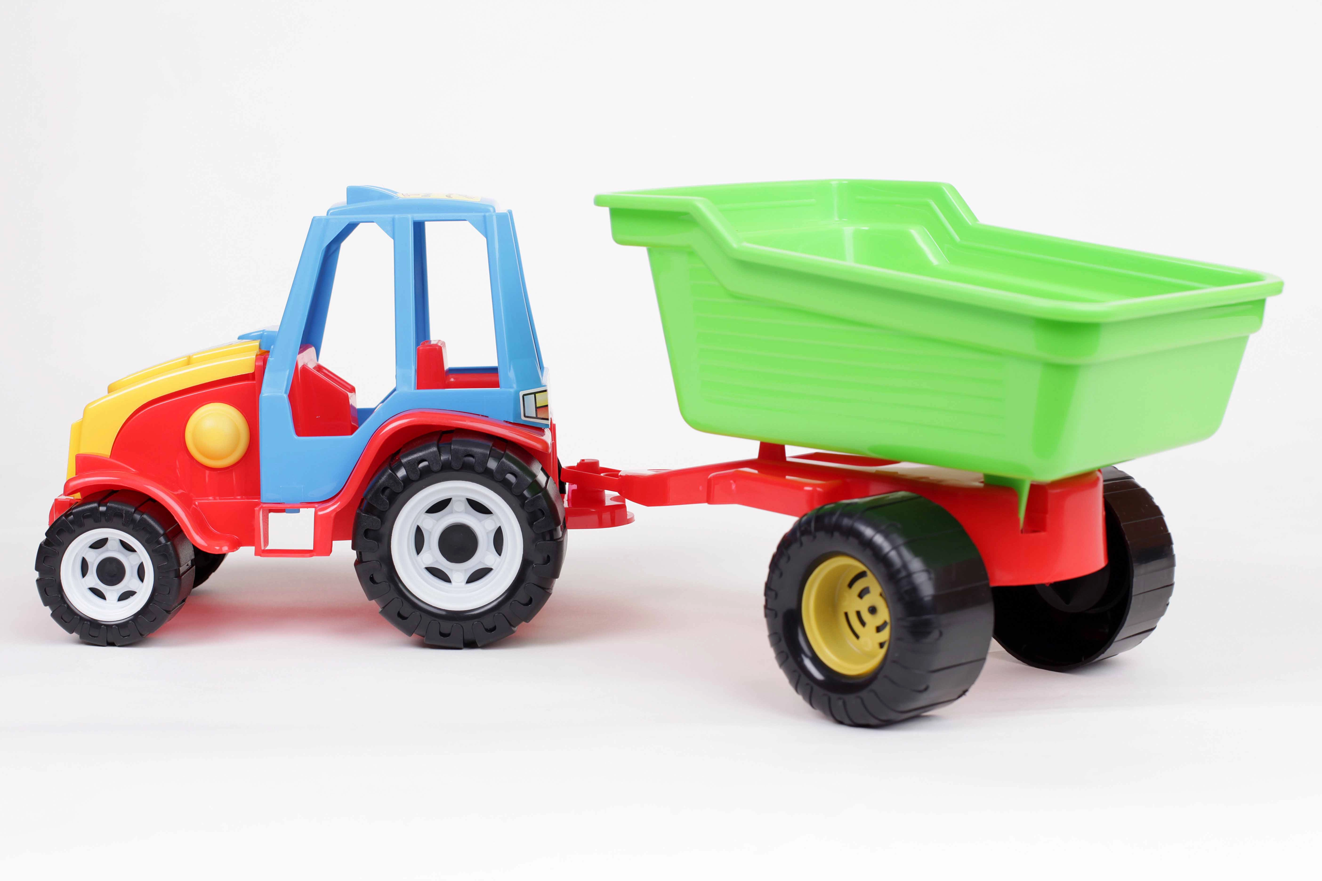 Színes műanyag traktor levehető, billenthető utánfutóval, amely örömet szerez a kis építőknek otthon, a homokozóban és a strandon is. Masszív kerekek, könnyű kezelhetőség és biztonságos, nehézfémektől mentes anyagok garantálják a hosszú órákon át tartó kreatív játékot és biztonságos szórakozást.