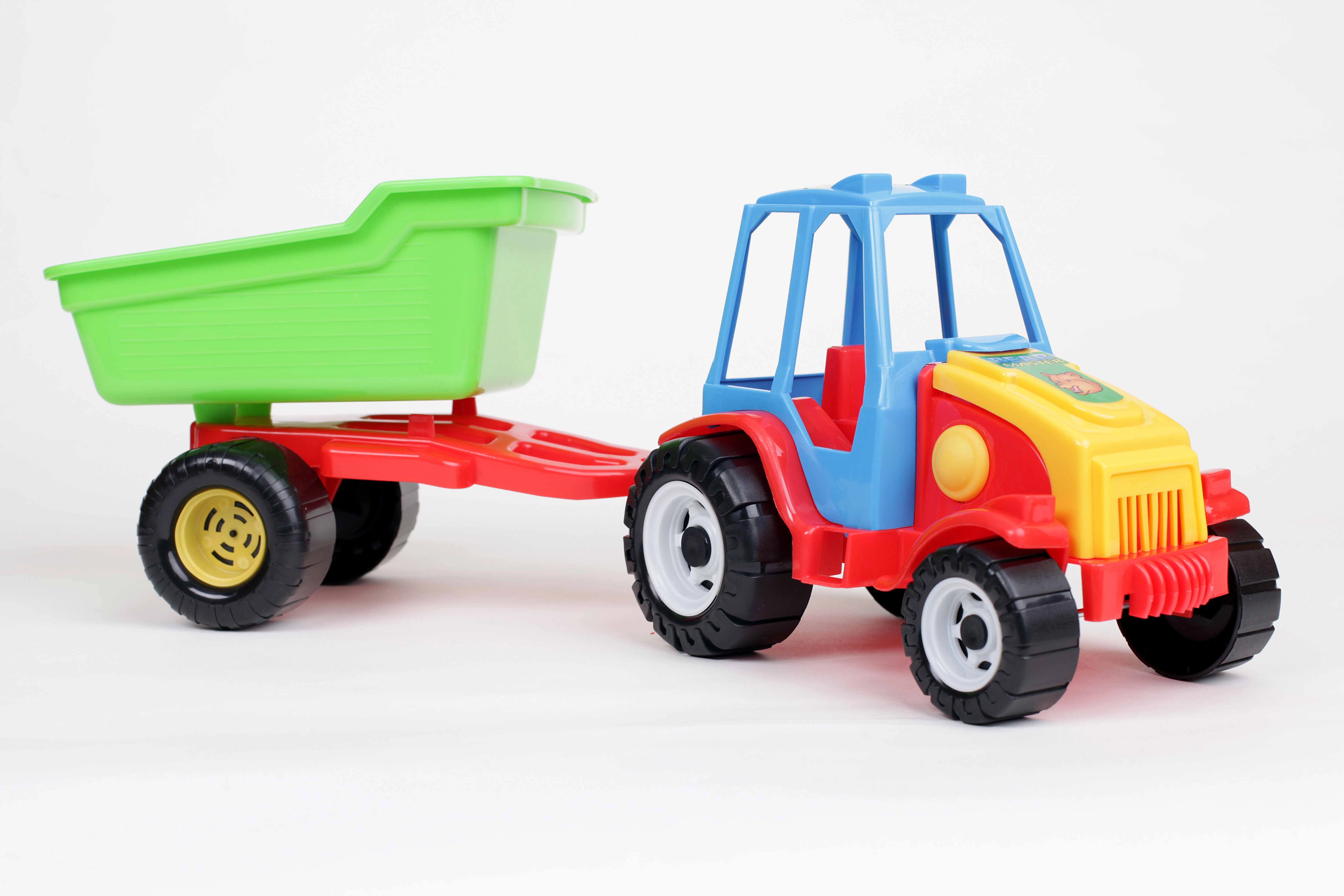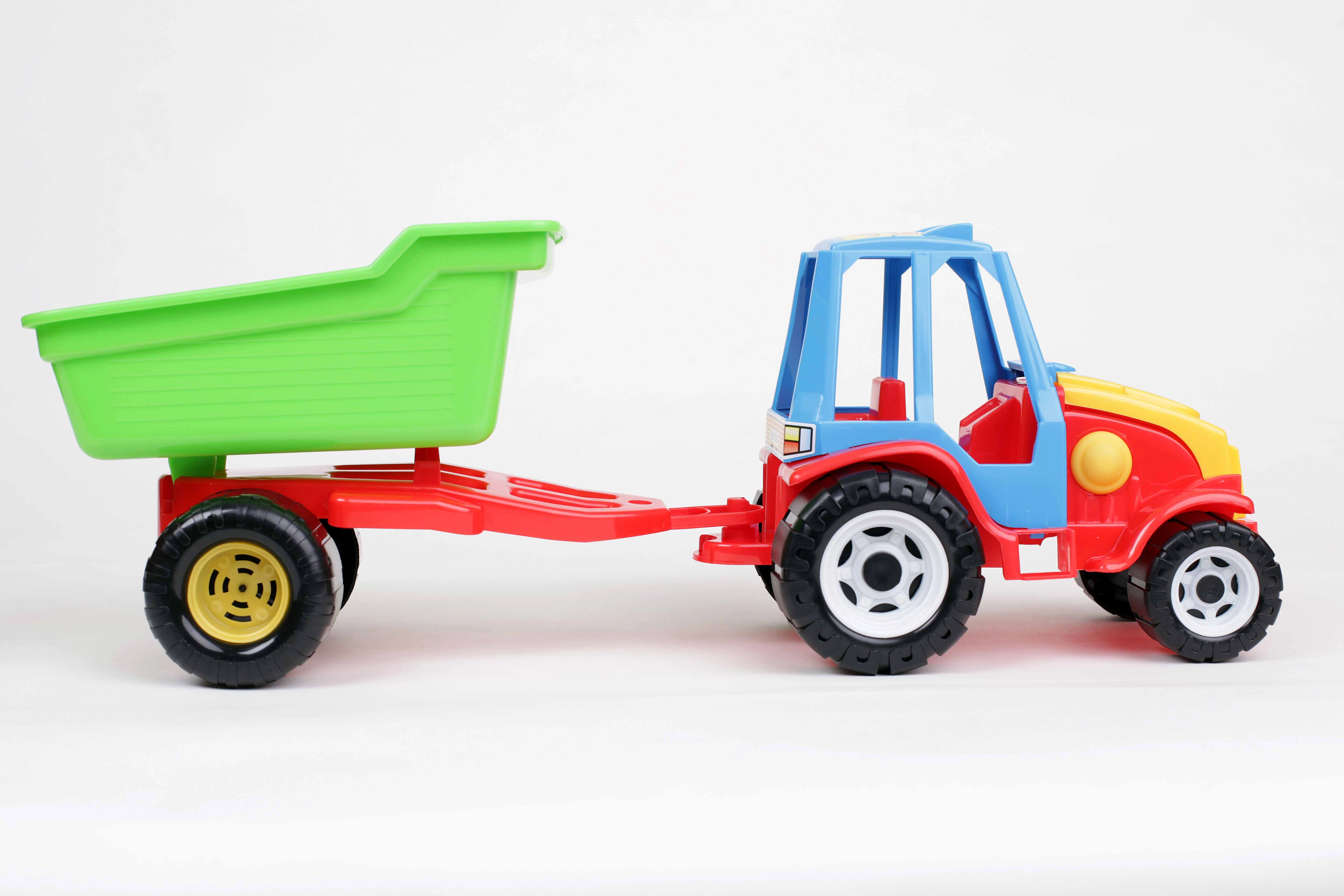 Fedezd fel a szórakozást a stabil műanyag traktorral és az egytengelyes utánfutóval, amely könnyen lecsatlakoztatható és hátrafelé billenthető. A nagy fekete kerekek sima mozgást biztosítanak padlón és homokban is, a színes kivitel pedig mindennapos játékra csábít. A játék magas minőségű, biztonságos anyagokból készül, nehézfém-vegyületek nélkül.