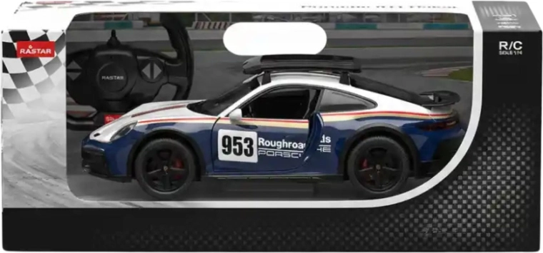 Licencelt R/C autó, a PORSCHE 911 Dakar a RASTAR márkától, 1:14 méretarányban, valósághű kidolgozással, zökkenőmentes 2,4 GHz-es irányítással és kiváló menettulajdonságokkal. Nyitható ajtók, LED világítás, négykerekű rugózás, nagy tapadású gumigumik és differenciálmű gondoskodnak a szórakozásról egyenetlen felületen is. A levehető tetőcsomagtartó és a legendás Porsche 953-ra utaló részletgazdag fényezés a gyűjtőknek és a gyerekeknek egyaránt örömet szerez.