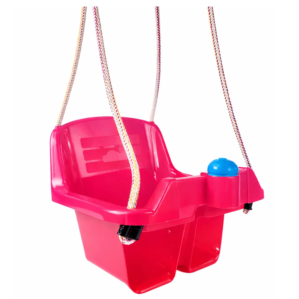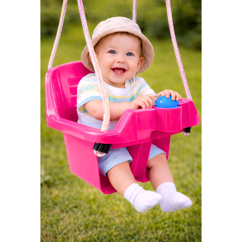 Ez a rózsaszín gyerekhinta biztonságos és örömteli hintázást kínál már körülbelül 10 hónapos kortól. A mély, vödör formájú ülés és a magas háttámla megfelelő testhelyzetben tartja a gyermeket, az elülső rúd pedig megakadályozza a kicsúszást. Erős köteleinek köszönhetően beltérben és a kertben egyaránt felszerelhető.