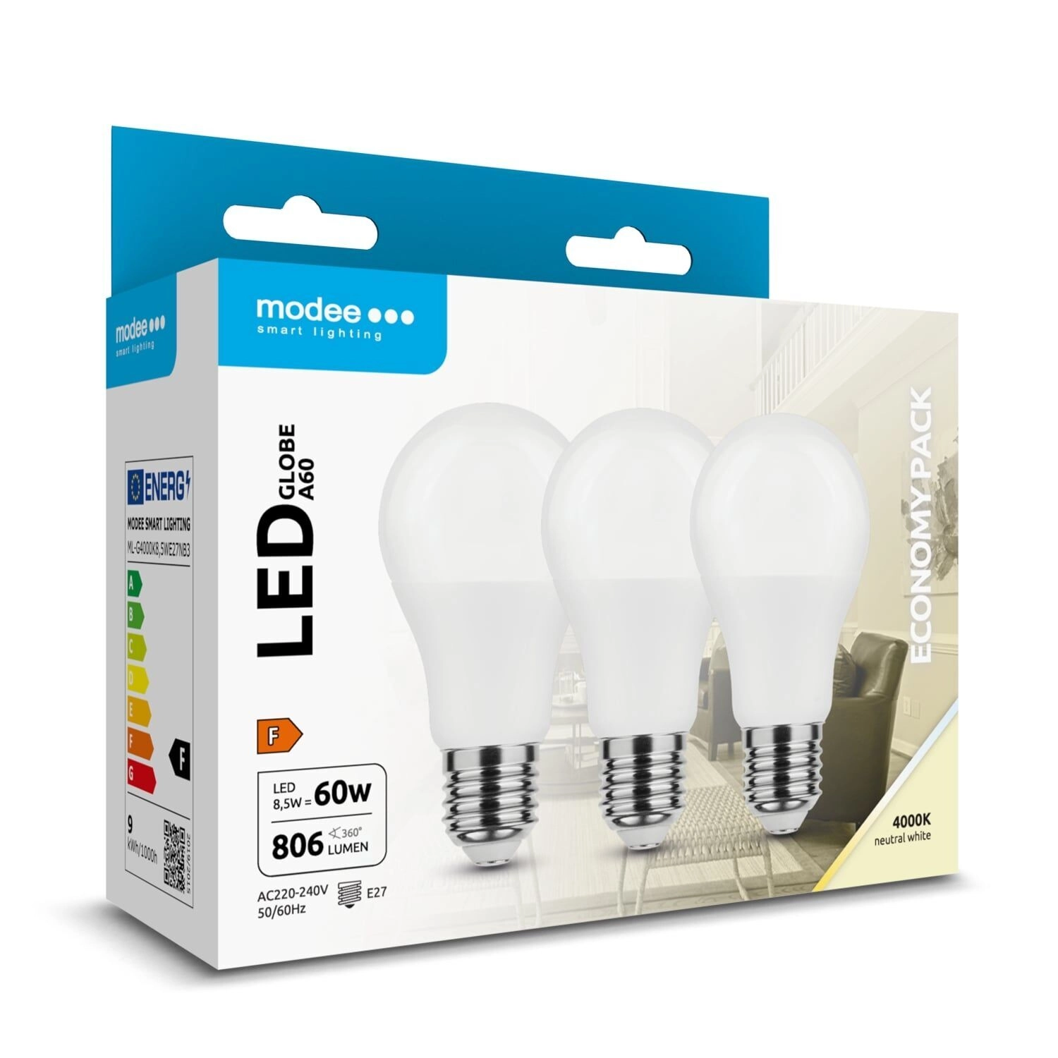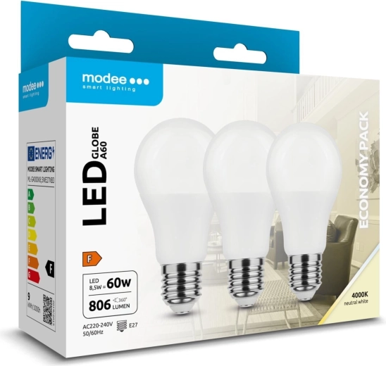Takarékos Modee Globe A60 LED izzó E27 foglalattal, fényárama 806 lm, kellemes semleges fehér 4000 K fénnyel és 270° széles sugárzási szöggel. A SMD LED technológiának, a minőségi alumínium magnak a hatékony hőelvezetésért és az akár 25 000 óra élettartamnak köszönhetően ideális otthonra és irodába. Praktikus 3 db-os csomag.
