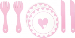 Mesés terítés! Varázslatot visz a gyerekkonyhába ez a szívmintás tányér- és evőeszközkészlet. Segít a gyerekeknek elsajátítani a helyes asztali illemszabályokat, és fejleszti a finommotorikát.