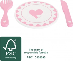 A kis fa szerviz szívecskékkel díszített, és 100% tanúsított FSC® fából készült. A gyerekek nemcsak a szép dizájnnak örülnek, hanem a környezettudatosságról és a fenntarthatóságról is tanulnak.