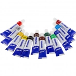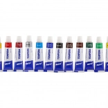 A készlet 12 közkedvelt árnyalatot tartalmaz 12 ml-es tubusokban: világos és sötétkék, világos és sötétzöld, világos és sötétsárga, világos és sötétpiros, világos és sötétbarna, fehér és fekete. Az alumínium tubusok csavarós kupakja pontos adagolást tesz lehetővé és védi a festéket a kiszáradástól.