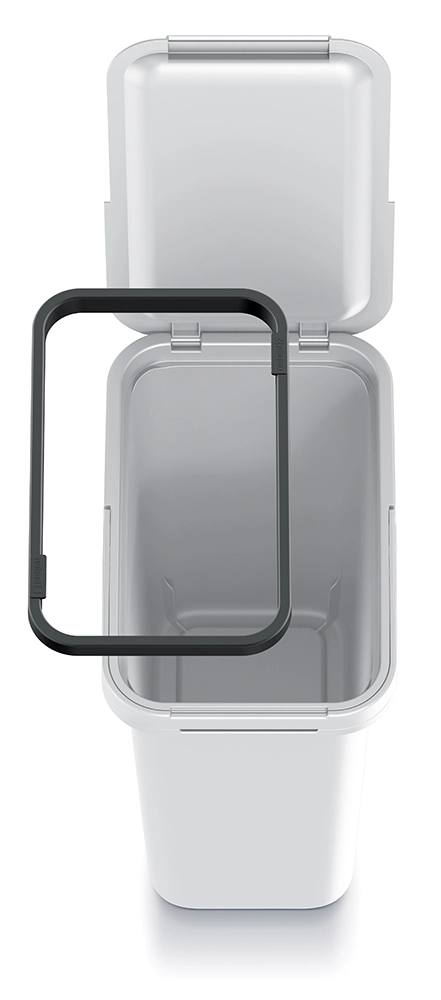 A billenő fedél lehetővé teszi a gyors és higiénikus hulladékbedobást, kellemetlen szagok nélkül. Az integrált belső keret szilárdan tartja a zsákot, megakadályozza a lecsúszást és megkönnyíti a cserét.