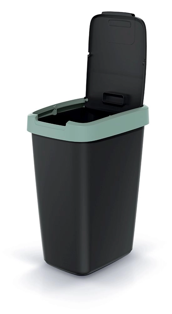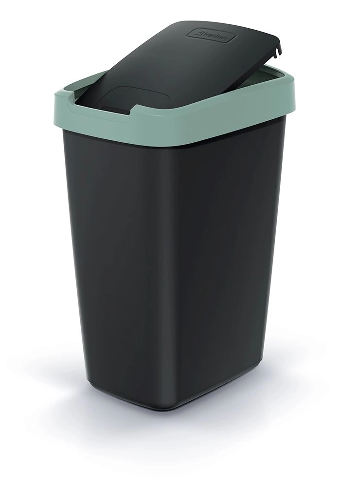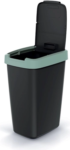 Kompakt, 12 literes szemetes fekete testtel és világoszöld peremmel, amely modern dizájnt, könnyű szemétbedobást és egyszerű karbantartást kínál. A billenő és felhajtható fedélnek, valamint a stabil, keskeny formának köszönhetően ideális konyhába, fürdőszobába és irodába.