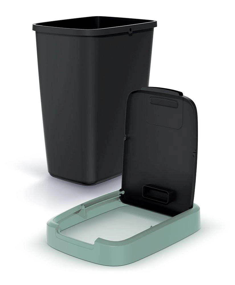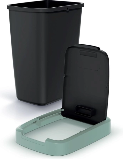 A matt felületű, strapabíró műanyag könnyen tisztítható, az elegáns fekete–mentazöld kivitel pedig illeszkedik a modern enteriőrökhöz. A téglalap alakú, enyhén kónuszos forma helytakarékos, és keskenyebb terekben is stabil marad.