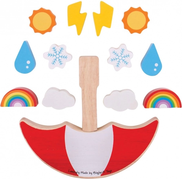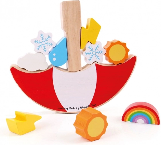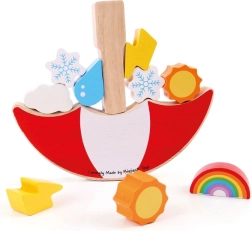 Milyen magasra tudod kiegyensúlyozni az időjárás-elemeket? Ez a lebilincselő egyensúlyozó játék ötvözi a szórakozást és a tanulást: a gyerekek fejlesztik a koordinációt és a logikus gondolkodást, miközben különböző formájú és súlyú darabokat helyeznek a billegő esernyőre. Minden lépés összpontosítást és finom mozdulatokat igényel – az utolsó sikeres játékos nyer!