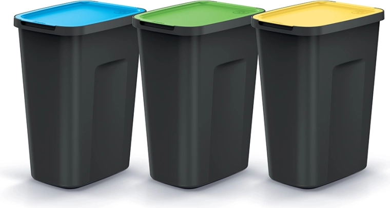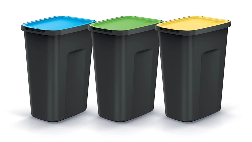 Praktikus COMPACTA Q FLAP PLUS szemetes szett három, egyenként 35 l-es, újrahasznosított műanyagból készült kukával, amely hatékony hulladékválogatást kínál otthonra és irodába. A kompakt méretek, a modern dizájn és a stay open funkcióval ellátott fedél kényelmes hulladékbedobást biztosít. Az alkoholnak, zsíroknak és olajoknak ellenálló felület könnyen tisztítható meleg vízzel és enyhe tisztítószerrel.