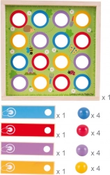 Szórakoztató családi játék 3 éves kortól, amely fejleszti a finommotorikát, a figyelmet és a kéz–szem koordinációt. A cél, hogy az indítók segítségével a színes golyókat a táblán lévő megfelelő nyílásokba lőjük. Játék 2–4 játékos számára piros, kék, sárga és lila színben. Felelősen beszerzett fából készült, és megfelel az európai biztonsági szabványoknak.