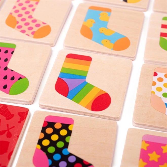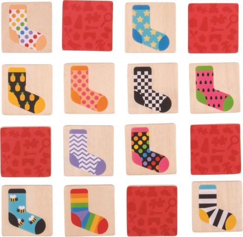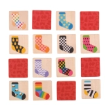 Gazdagítsa a gyerekekkel töltött játékidőt fa memóriakártya zoknikkal. Ez a játék serkenti a memóriát, támogatja a koncentrációt és a stratégiai képességek fejlesztését. Csak helyezze le a 32 fa játékelemet lefelé fordítva, és kezdje el egyszerre két darabot felfedni. A nehézség fokozatosan nő, a játékosok megpróbálják párosítani a zoknikat és elsajátítani új stratégiákat.