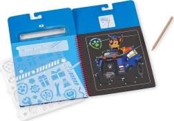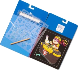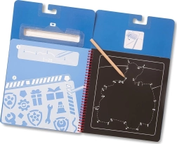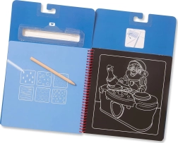 A készlet része egy fa kaparó, sablonok és matricák. A gyerekek átrajzolhatják a formákat, kiegészíthetik a jeleneteket, és fejleszthetik finommotorikájukat.