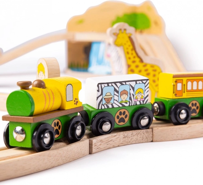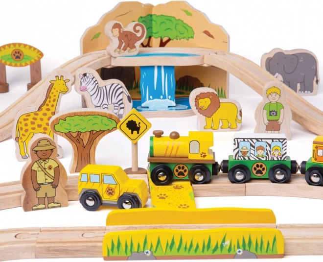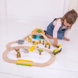 Fedezd fel a szafari világát ezzel a színes, masszív fa vonatpályával, amely 3 éves kortól örömet szerez. A szettben olyan állatok vannak, mint elefánt, zebra és majom, továbbá fák, táblák és egy híd, amelyen egy sárga mozdony két kocsival halad át. A mágneses kapcsolóknak köszönhetően a játék intuitív és könnyen bővíthető.