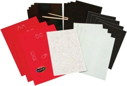 • A készlet tartalma: 16 kaparós kép (kb. 21,5 × 14 cm), 2 fa toll, sablonok, 3 tartóállvány.