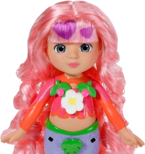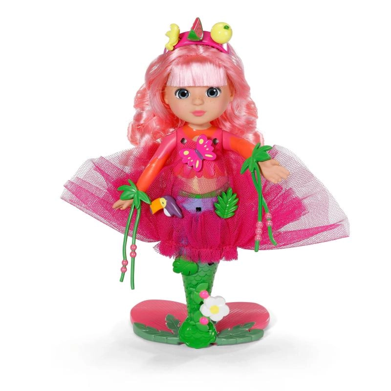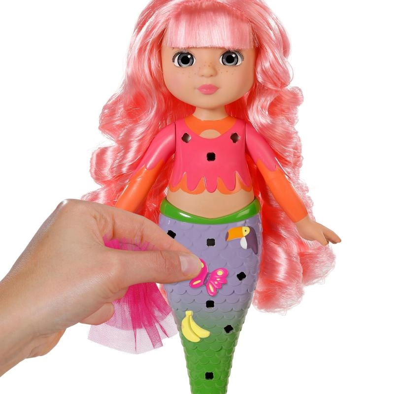 Lépj be a BABY born Glam Up csillogó világába! Sunshine egy tengeri sellő, aki imádja az átalakulást – a frizurától egészen az uszonyig. A hosszú, rózsaszín haj varázslatos UV-effektjének köszönhetően minden alkalommal más megjelenést alkothatsz, napsütésben pedig igazi wow élmény vár. A mellékelt textil kiegészítők, színes pattintható díszek és a cuki mini állatka levehető uszonnyal megnyitják a gyerekek előtt a fantáziadús styling és a saját történetek mesélésének világát.
