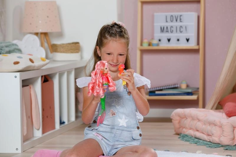 Sunshine mozgatható karjai megkönnyítik a pózolást és a játékot. Nem csak a hajat lehet díszíteni, hanem a farkat és az uszonyt is, így minden napra egyedi kombinációk születnek. Az inspirációs füzet további barkács tippeket mutat be olyan anyagokból, amelyek a gyerekeknél rendszerint otthon megtalálhatók – a szórakozás így sosem ér véget.