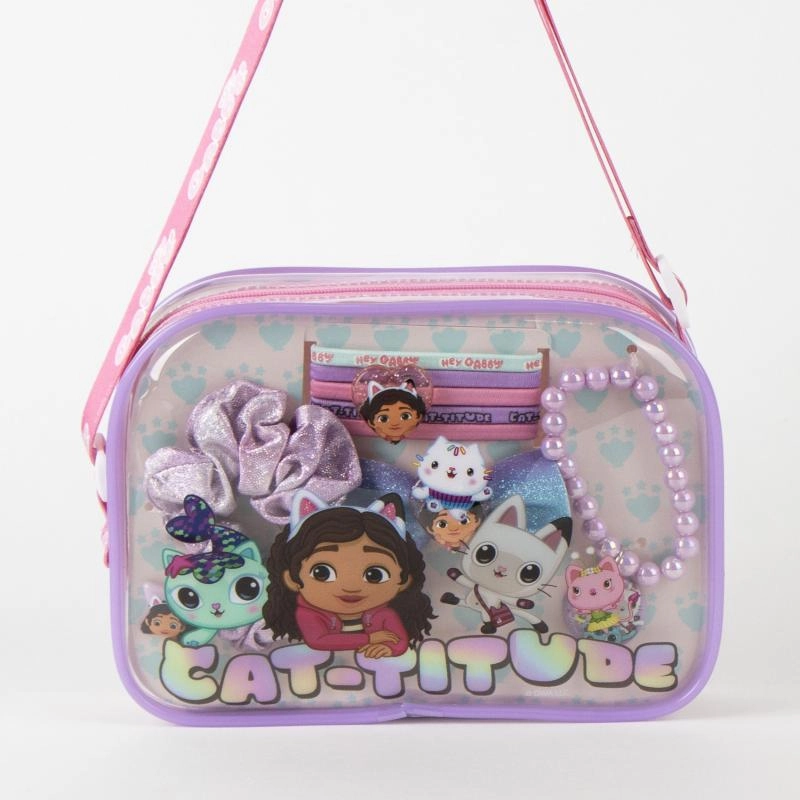 Készíts könnyedén gyönyörű frizurákat a kedvelt GABBY DOLL'S HOUSE világából ihletett, színben összehangolt szettel. A kompakt tasaknak köszönhetően minden kiegészítő áttekinthetően egy helyen van – ideális otthonra és utazáshoz is.