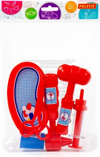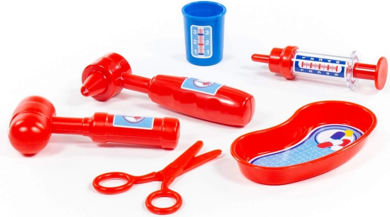 Szórakoztató gyermek orvosi készlet 6 alapvető eszközzel (olló, fecskendő, tálka, otoszkóp, reflexkalapács és mérőpohár), amely fejleszti a fantáziát, az empátiát, és segít csökkenteni az orvosi környezettől való félelmet. Ideális otthoni és barátokkal való játékhoz.