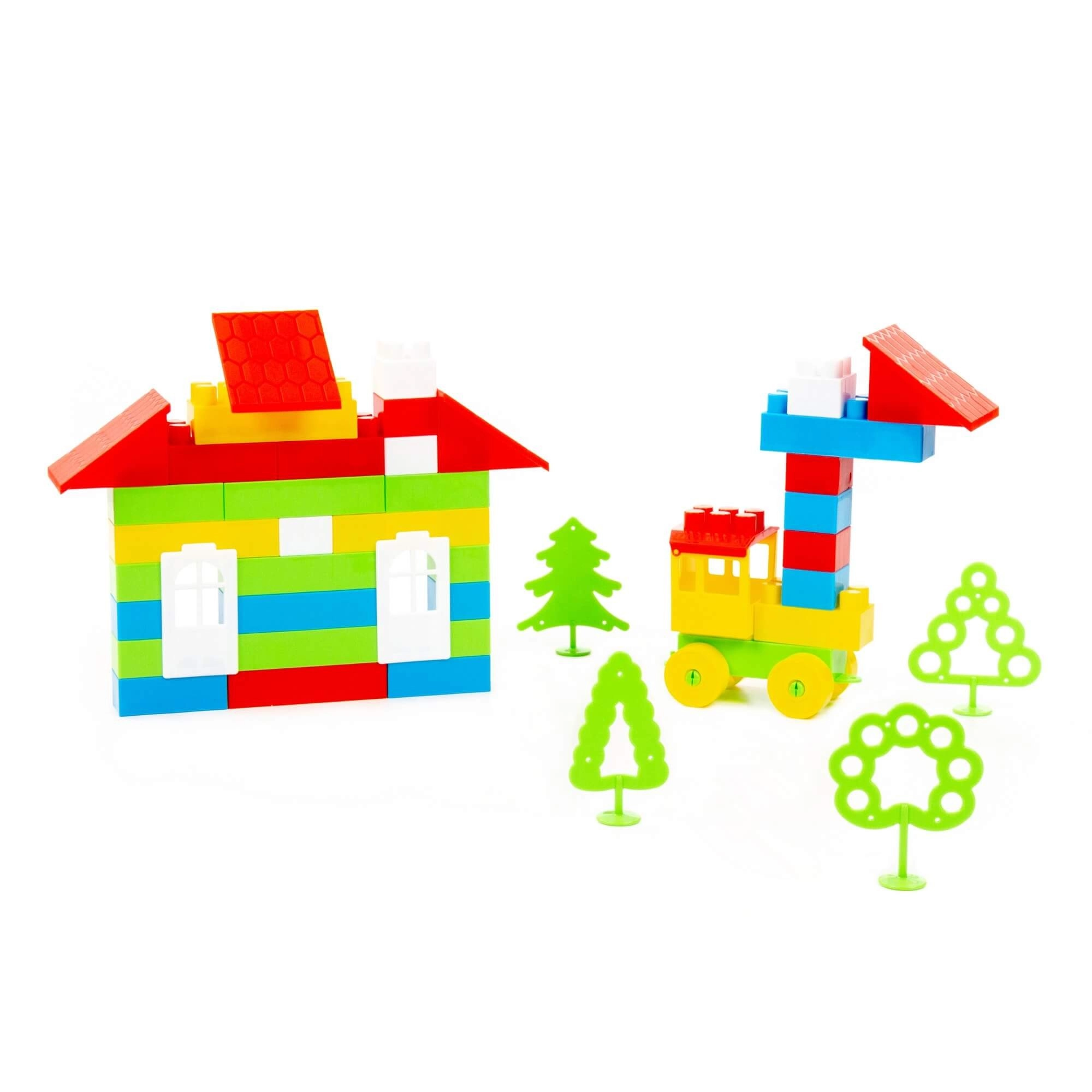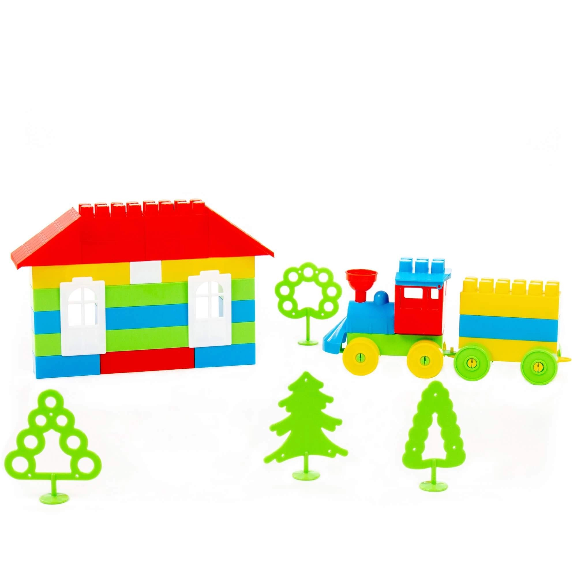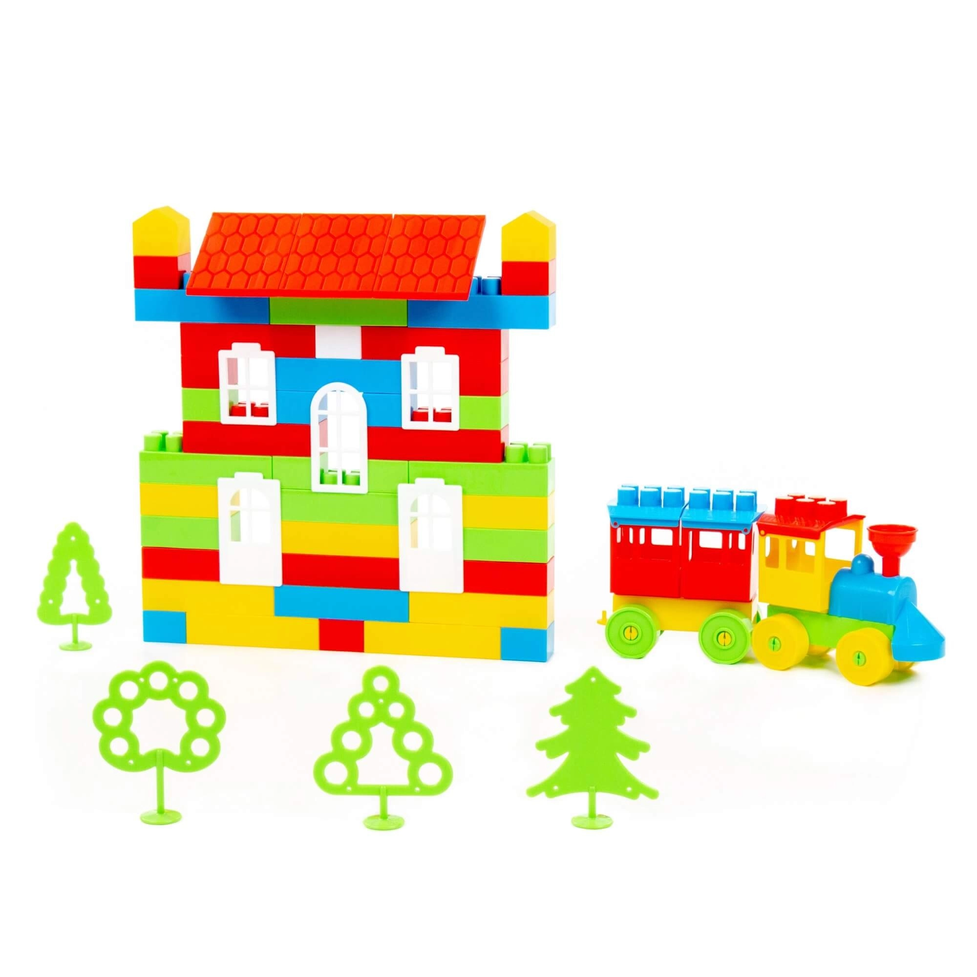 Építs kétszintes házat tetővel és ablakokkal, majd egészítsd ki a jelenetet vonattal és fákkal a még szórakoztatóbb játékért.