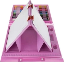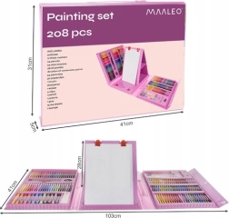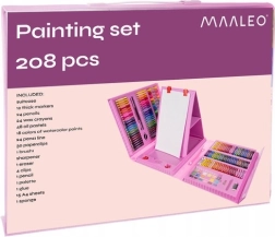 A készlet 208 darabot tartalmaz, beleértve a filctollakat, pasztell és viasz ceruzákat, akvarell festékeket és sok más kelléket.