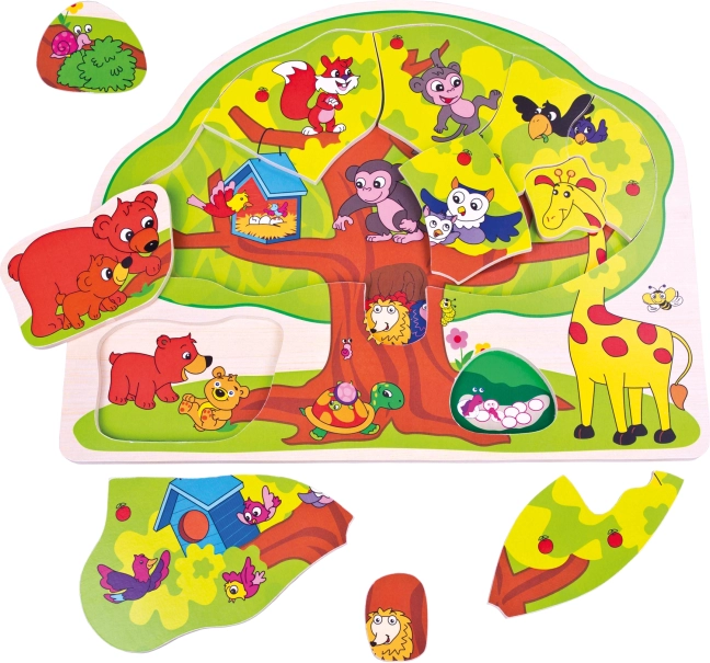 Fedezze fel a fa, fa alakú kirakót 11 darab állatfigurával, amely fejleszti a logikus gondolkodást, a képzeletet és a finommotorikát. A masszív rétegelt lemez és a tartós kivitel hosszú élettartamot és biztonságos játékot biztosít már 12 hónapos kortól.