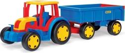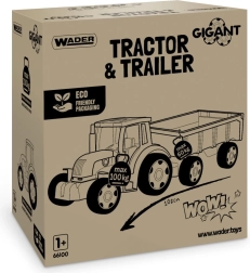 Nagy, Gigant sorozatú traktorunk pótkocsival érkezik, nyitható hátsó ajtóval. Ezek a járművek ideális játékok gyerekeknek építéshez, rakodáshoz vagy anyagok szállításához. A traktor mozgatható kanala bulldózerként vagy rakodógépként is használható, ami még szórakoztatóbbá teszi a játékot. Ennek a traktornak az előnye a minőségi kivitel, a tartósság és a teherbírás – a traktor akár 100 kg-ot, a pótkocsi 60 kg-ot bír el.