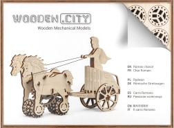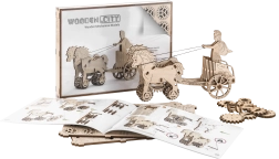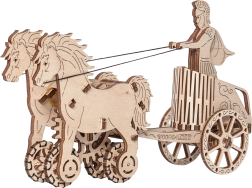 A birodalom nevében. Római szekér kétszeres fogattal, rétegelt lemezből. A hűen megformált kocsiban részletgazdag római lovas figura kapott helyet. A felhúzható mechanizmusnak köszönhetően a modell képes haladni, induláskor a vontató kettesfogat felágaskodását is bemutatja, és akár 1 métert megtesz. Rendezzen versenyeket más Wooden City modellekkel! Részletes szerelési útmutatóval felszerelve. Főbb jellemzők: 74 precízen kivágott alkatrész, könnyű összeszerelés, a kész modell önállóan képes haladni