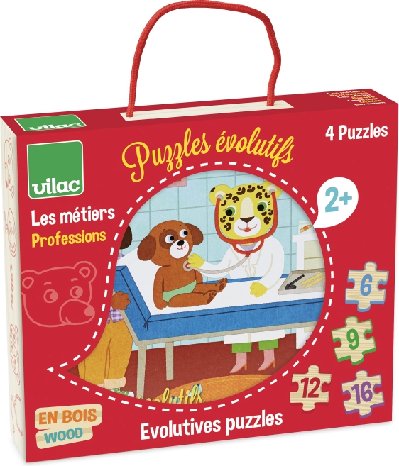 A szett négy fejlődési puzzle-t tartalmaz különböző foglalkozások motívumaival, úgy tervezve, hogy motiválja a gyerekeket a folyamatos fejlődésre. Az eltérő darabszámnak köszönhetően a kis kezek elsajátítják a helyes kirakási technikákat, és megtanulják felismerni az alakzatokat és a színeket.