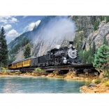 A puzzle történelmi mozdonyt ábrázol, ahogy az gyönyörű hegyi tájon halad át. Ez az elbűvölő kép ideális a vonatok és tájképek szerelmeseinek.