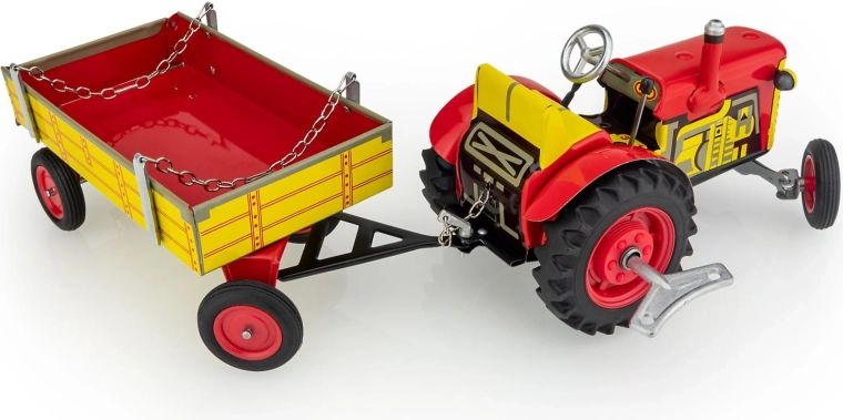 Klasszikus bádog játék kicsiknek és nagyoknak, a mezőgazdasági technika rajongóinak: Zetor traktor lekapcsolható platós pótkocsival és kulcsos rugós szerkezettel. 3 fokozatot kínál (előre, üres, hátra), működő kormányzást és kéziféket. Precíz cseh kézműves kivitel, Biztonságos játék tanúsítvány és nyomtatott bádoglemezből készült, tartós felépítés műanyag kerekekkel.
