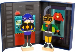 Ez az ötletes mágneses készlet órákon át tartó szórakozást és végtelen kombinációs lehetőséget kínál. A 27 mágnesből több mint 80 különböző jelmezt állíthattok össze – a bátor szuperhősöktől a mókás variációkig, amelyek beindítják a gyerekek fantáziáját. A két nagy figurát a mellékelt fa talpakba állíthatjátok, így nemcsak asztalon lehet velük játszani, hanem ki is lehet őket állítani.