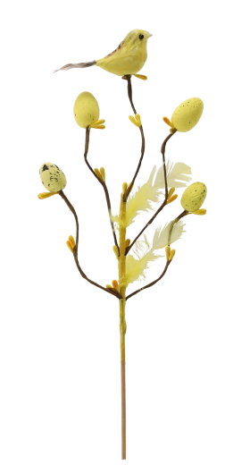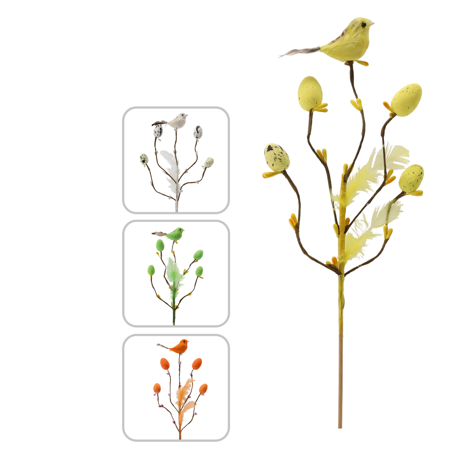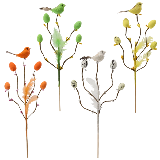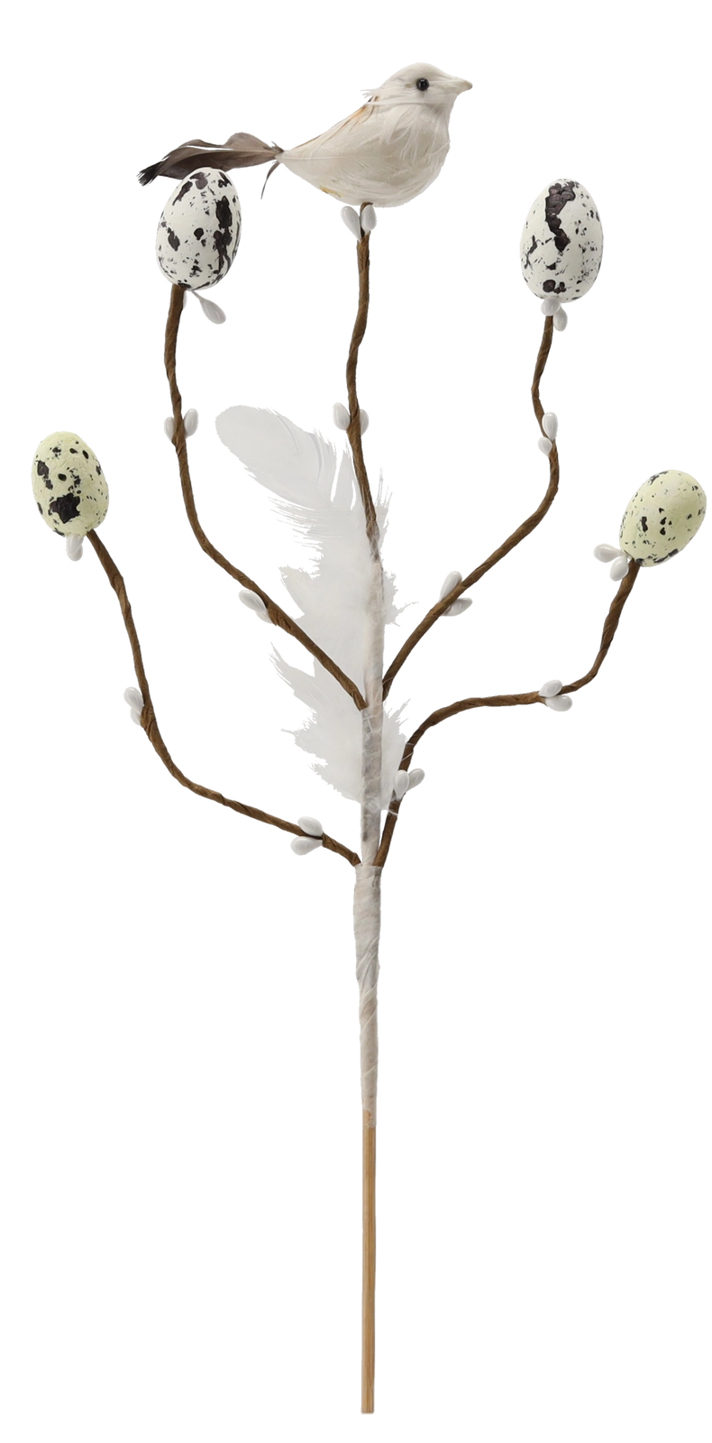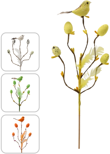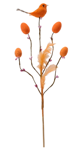 Ez a stílusos, pálcára erősített húsvéti dekor frissességet és a tavasz örömét hozza a belső térbe. Az apró elágazásokkal díszített ágacska madárral, finom tollakkal és pettyezett mintájú tojásokkal egészül ki, természetes és játékos hatást keltve. A karcsú szárnak köszönhetően könnyedén leszúrható virágkompozíciókba, mohás dekorokba, vagy elhelyezhető keskeny vázában.