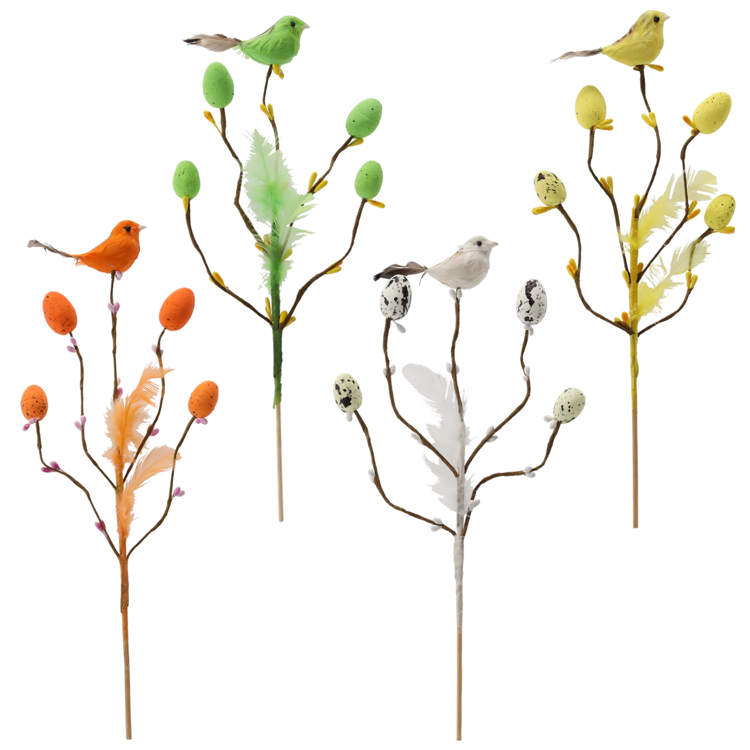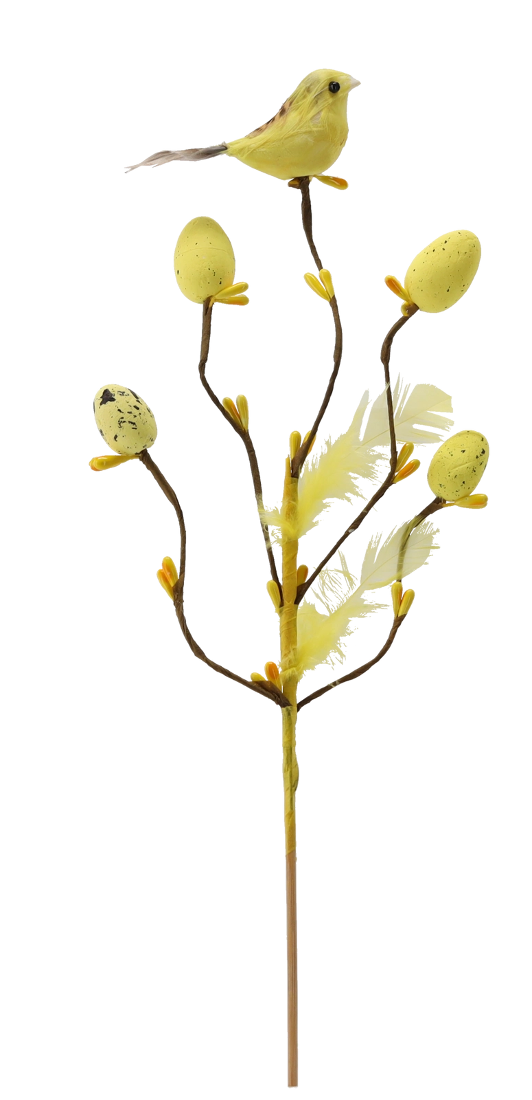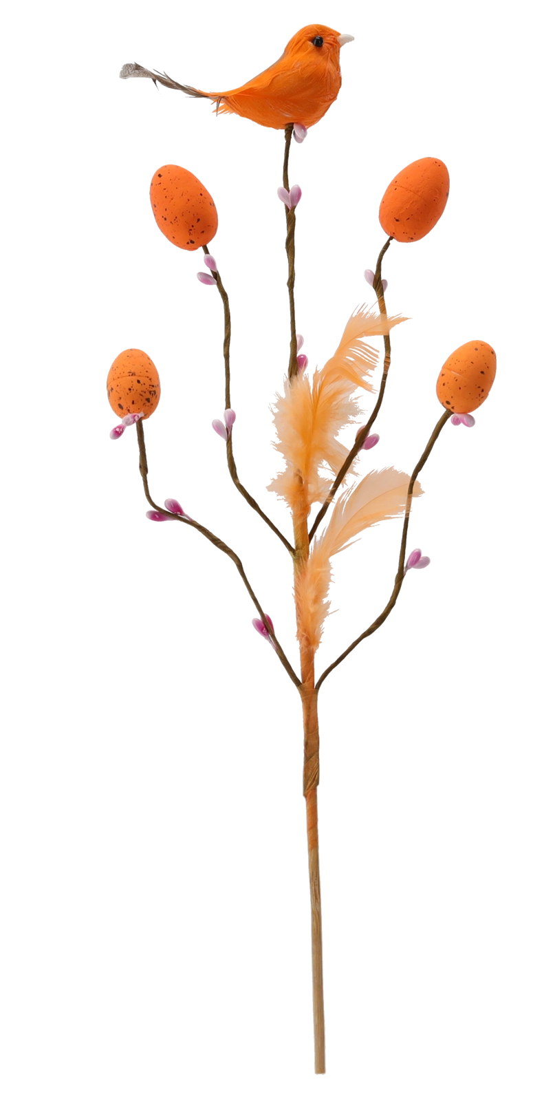 Ez a stílusos, pálcára erősített húsvéti dekor frissességet és a tavasz örömét hozza a belső térbe. Az apró elágazásokkal díszített ágacska madárral, finom tollakkal és pettyezett mintájú tojásokkal egészül ki, természetes és játékos hatást keltve. A karcsú szárnak köszönhetően könnyedén leszúrható virágkompozíciókba, mohás dekorokba, vagy elhelyezhető keskeny vázában.