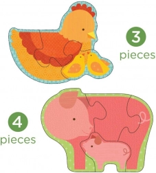 A készlet négy különböző kirakót tartalmaz, darabszáma 3-tól 6-ig terjed, ami megkönnyíti a fokozatos nehézség növelését.