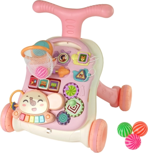 A rózsaszín interaktív járássegítő és játékasztal 2 az 1-ben támogatja az első lépéseket, miközben fejleszti az érzékelést és a finommotorikát. Levehető oktatási panelt kínál zongorával, fogaskerekekkel, formákkal, labdakosárral és forgó kockákkal. A hátsó kerekek rögzítésének és a vízzel tölthető tartálynak köszönhetően a játék biztonságos és stabil. A panel lecsatolható, és önállóan is használható otthon és útközben.