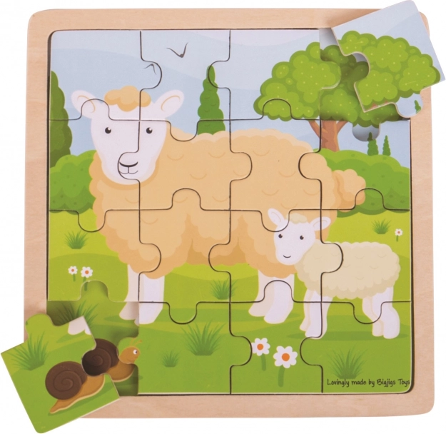 Ez a BIGJIGS TOYS fakeretes kirakó kedves juh és bárányka motívumot kínál, amely első pillantásra elbűvöli a gyerekeket. A darabok közvetlenül a keretbe illeszkednek, azonos mintájú alapra, így a kép nem csúszik el, és a gyerekek könnyen látják, melyik darab hova való.
